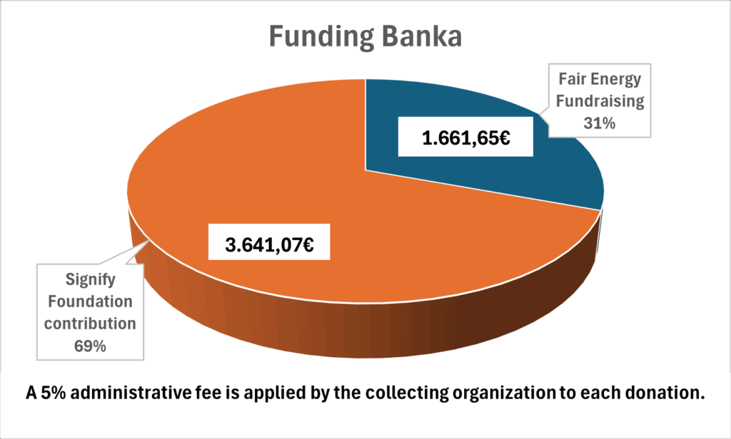 Le projet à Banka est soutenu par la Signify Foundation, qui contribue à hauteur de 3.641,07 € en fournissant l’éclairage qui va être installé. Une levée de fonds Fair Energy 25 est en cours pour compléter le financement avec un montant de 1.661,65 €, afin d’assurer la mise en place complète du projet.